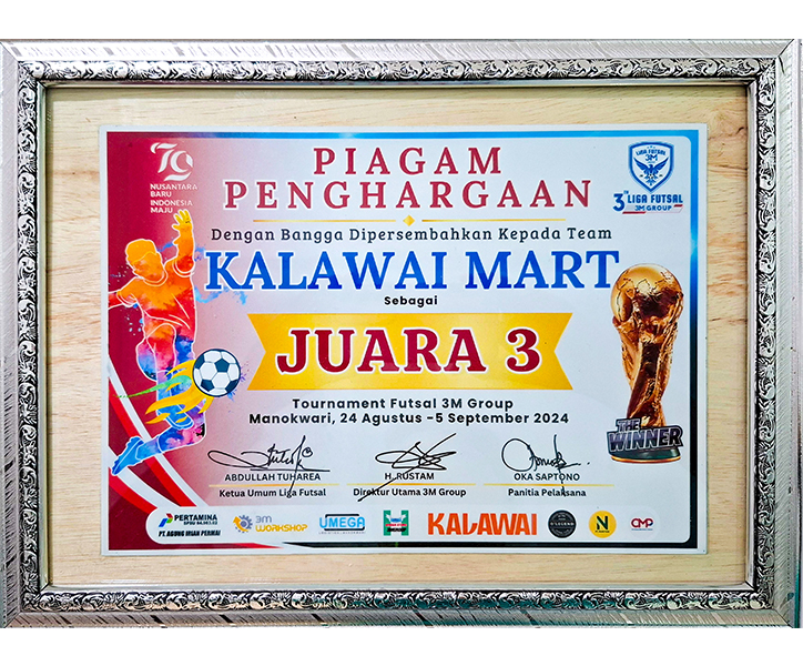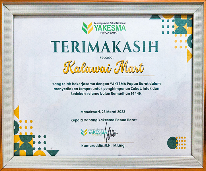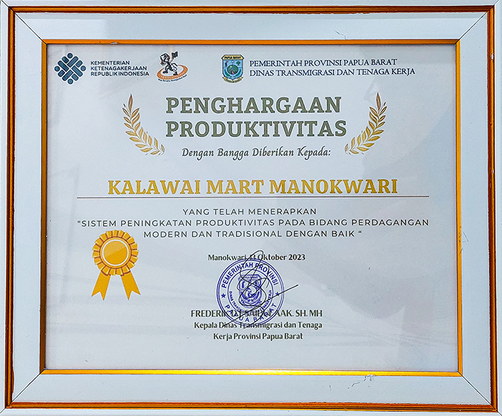 - Penghargaan dari Pemerintah Provinsi Papua Barat melalui Kementerian Tenaga Kerja RI, berupa Penghargaan Produktivitas tentang Penerapan Sistem Peningkatan Produktifitas usaha Bidang Perdagangan Modern dan Tradisional dengan baik Tahun 2023.
