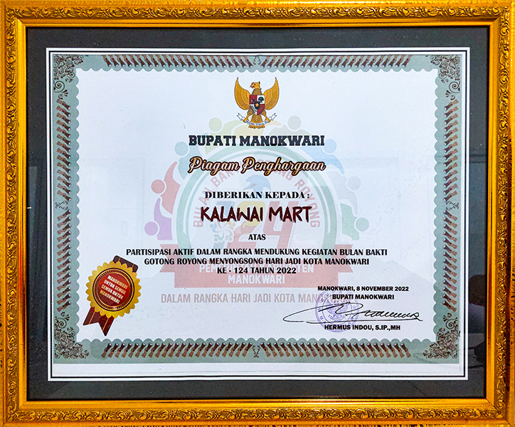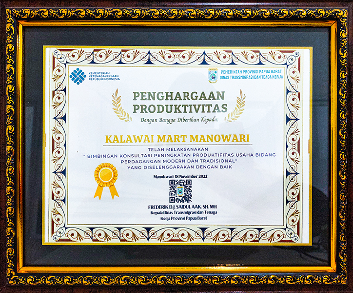 - Penghargaan dari Pemerintah Provinsi Papua Barat melalui Kementerian Tenaga Kerja RI, berupa Penghargaan Produktivitas tentang Bimbingan Konsultasi Peningkatan Produktifitas usaha Bidang Perdagangan Modern dan Tradisional Tahun 2022.
