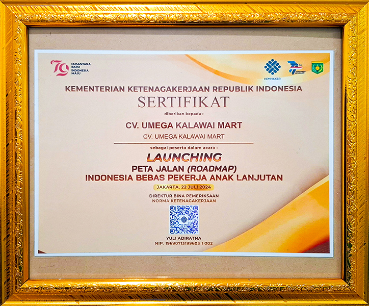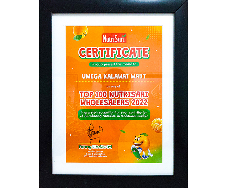 - Sertifikat dari Distributor Nutrisari tentang Pencapain target Penjualan khusus Produk Nutrisari, dimana Kalawai Mart Masuk 100 Besar dalam pencapaian target tersebut secara Nasional.